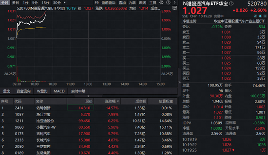 29日早盘,港股汽车产业链全线走高,整车、汽车零部件表现活跃,中证港股通汽车产业指数领涨超2%。成份股大面积飘红,佑驾创新涨超16%,浙江世宝涨超8%,小鹏汽车、吉利汽车、比亚迪股份均涨超5%。热门ETF方面,今日上市首秀的港股通汽车ETF华宝(520780)场内一举飙升超2%,实时成交额近2亿元领跑同类。