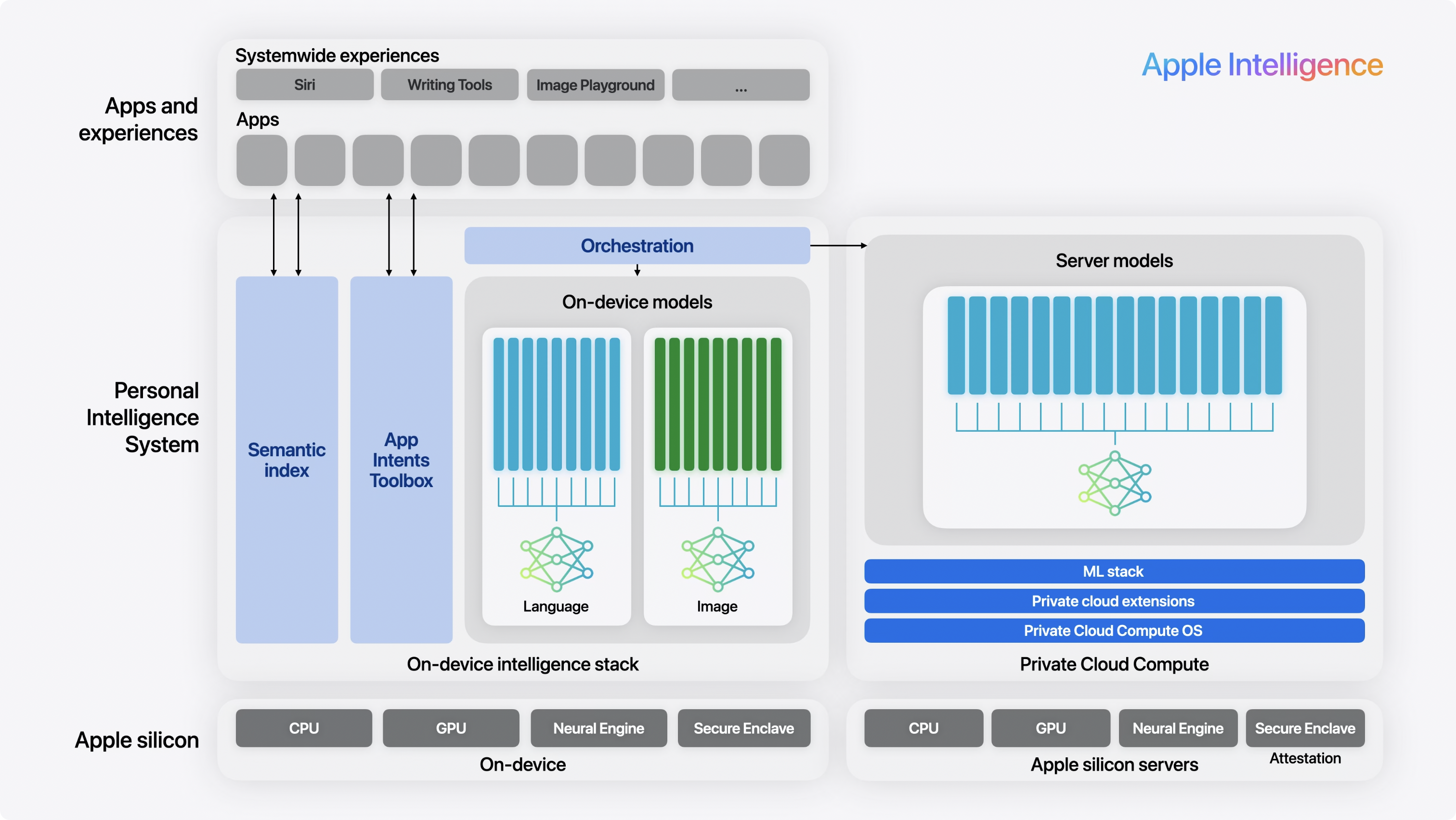 Apple Intelligence 的架构虽然本文并不是要介绍「什么是 Apple Intelligence」,但要正确理解 Apple Intelligence 我们还是不可避免地要看看它的架构,最直观、最高效的呈现方式是下图: