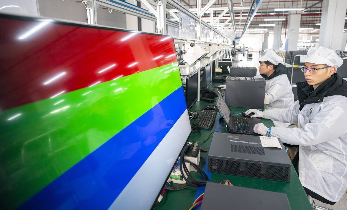 武汉精测电子集团股份有限公司, 技术人员在检测显示屏测试设备。(湖北日报全媒记者 魏铼 摄)