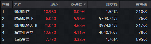 港股医疗主题板块大面积飘红,AI医疗、医械相关概念股领涨,微创医疗涨8%,脑动极光-B、微创机器人-B分别涨超5%、4%,港股通医疗主题指数盘中涨近1%。ETF方面,跟踪该指数的港股通医疗ETF华宝(159137)正在发售中。